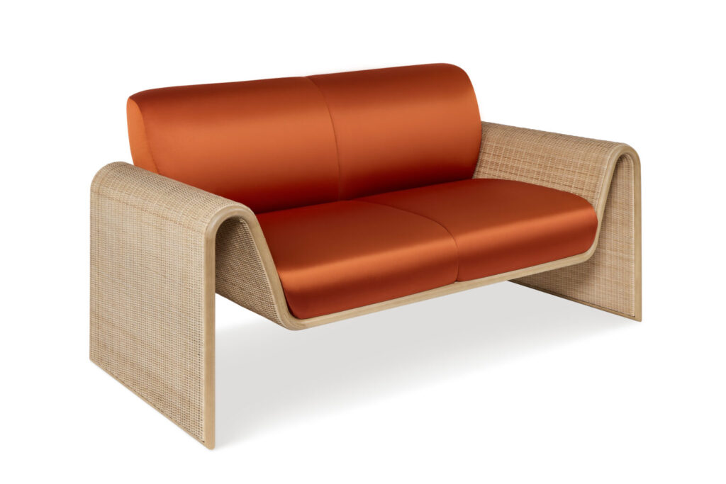 Seguendo il percorso, attraversando la corte e il porticato, gli ospiti sono condotti al primo piano, nelle sale che sono parte dell’atelier Armani Privé. Nella prima stanza sono visibili alcuni pezzi in midollino, dalle linee sinuose, a sottolineare il passaggio dall’esterno all’interno con sottili modulazioni di tonalità neutre. Immaginando una nuova configurazione della casa, lo spazio living è amplificato creando continuità ed estetica. Così il tema della leggerezza e il concetto del vestire gli elementi di arredo con giochi di intrecci torna in questi mobili pensati per la veranda: la dormeuse Pretty, il divano e la poltrona con pouf Sharon, i tavoli Melrose e Ted, con piano in pregiata quarzite Taj Mahal e dettagli di ottone, che si aggiungono a pezzi continuativi – tavolo Nelson e mobile Riesling – esposti nella boutique di corso Venezia.